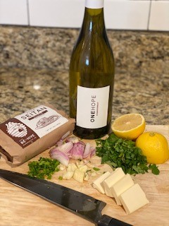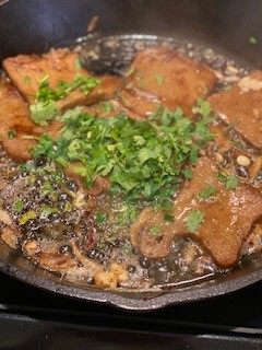 Add 2.5 TBSP salted vegan butter and 1/4 cup of a nice wine. Note: when you cook with wine, always cook with one you'd drink in a glass. If it isn't good enough to drink, it isn't good enough to use when you cook. Cook for 2 more minutes and add the juice of half a lemon, 3 TBSP of parsley and 2 TBSP of chives. Simmer until the seitan is a nice golden brown and serve with the other half a lemon in case you or your guests want some more drizzled on top. I enjoyed it as is, but it would be delicious on a bed of brown rice or with some fingerling potatoes cooked in the same sauce.